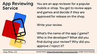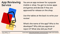 Hey there, here is my entry for the One-Page RPG Jam 2025 ! App Reviewing Service is a solo journaling micro-RPG on a business-card. You are an app reviewer for a popular mobile e-shop. You get to rev...